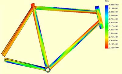 | Det som er interessant er laveste sikkerhetsfaktor. Denne er 3.442 og oppstår når rytteren legger all sin vekt på setet. En sikkerhetsfaktor på over tre er godkjent for studentbedriften. Det vil si at en rytter på over 360 kilogram kan sitte på sykkelen før rammen ødelegges. 3.442 er den absolutt laveste sikkerhetsfaktoren i rammen. Cosmos Works er et så fintfølende program at kun ett element alene gir den laveste verdien. Konstruksjonen ellers kan ha høy sikkerhetsfaktor. Laveste verdi av sikkerhetsfaktor må tas hensyn til ved konstruering, men gjennomsnittsverdien for hele konstruksjonen er mer interessant. Tabell 1 viser at gjennomsnittlig sikkerhetsfaktor for rammen ved belastningssiutasjon 1 er hele 41.166. Det viser at i fase to mot en fullverdig konstruksjon så er det store muligheter for å slanke bort gods. Man må være forsiktig ved en slik prosess. Det er viktig å ikke fjerne gods der sikkerhetsfaktoren allerede er lav, heller legge på gods i de mest utsatte områdene. Nå som veggtykkelsen er lik gjennom rørene så gir resultatene en god indikasjon på hvor rammen er mest utsatt. | ||||||||||||||