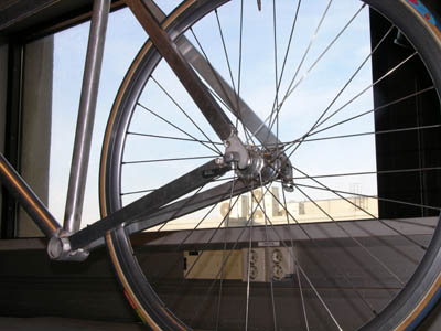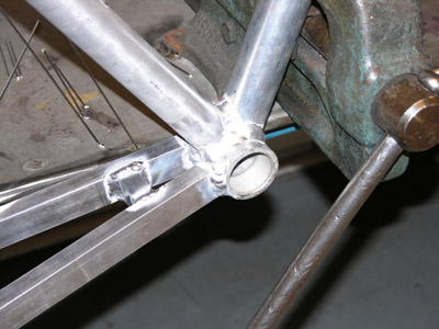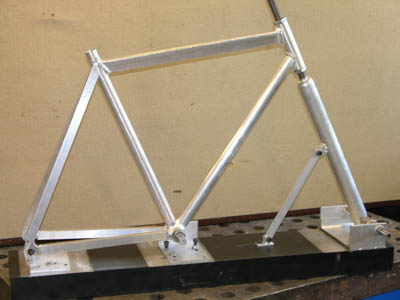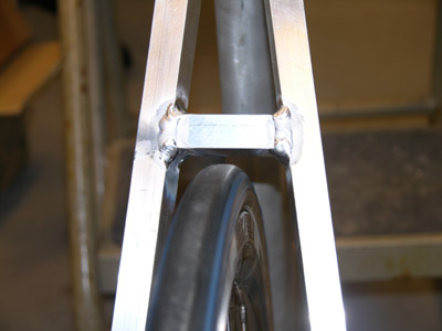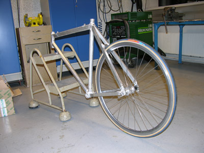 | Det er veldig viktig for enhver sykkelramme at hjulet står rett i rammen. Står det litt skjevt, kan man få problemer med bomgiring og dårlig bremseeffekt. Derfor testet vi med et hjul at ting gikk som det skulle før vi sveiset rørene 100% sammen. | ||||