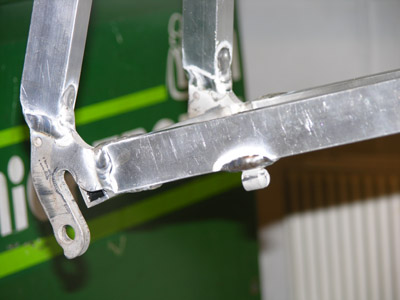 mellom bakrammerørene hvor bakbremsen skal festes og alle vaierføringene.