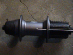 | Da tar vi en liten pause med eikene på høyre side. Skal nå sette i de utvendige eikene på venstre side. De som også har eikehodet festet på innsiden av navet. Først skal vi finne plasseringen til eiken i navet. Her er det viktig å studere bilde nr 7 nøye. Jeg tar nå utgangspunkt i eike nummer 3 fra høyre. Som du ser har jeg allerede satt i eiken på andre siden av navet. Dersom du sikter gjennom hullet i navet som den hitterste eiken går igjennom, ser du at hullet er litt til høyre for hullet den venstreeiken er tredd igjennom. Siden venstreeiken (den på andre siden av navet,venstre side) har et hull som da er litt til venstre, så skal denne eiken festes i felgen i hullet til venstre for høyreeiken. den jeg tok utganspunkt i. | ||||