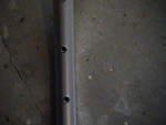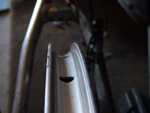 Så skal vi finnet ut hvor på felgen vi skal sette i den første eiken. Eiken som vi allerede har festet i navet. Som man ser på Bilde 3, så har vi venstre-hull og høyre-hull. Vi ser at det nederste er boret litt mot høyre, mens det øverste er boret mot venstre. Har ikke noe å si hvor på felgen du begynner, bare velg to hull, velg så det som heller mot høyre siden vi valgte å begynne med eikene på høyre side av navet. Bruk en nippel og fest eiken i det høyredreide hullet. Bare skru nippelen litt inn på eiken. | ![]() |