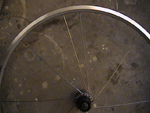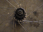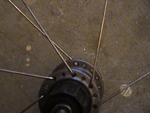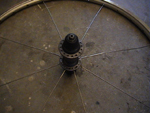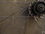 | Da kan vi begynne byggingen. Legg navet ned på bakken, med bosset pekende mot høyre. Jeg velger å begynne med eikene som har "hodet" på eiken, festet på innsiden av navet. Tre i første eike slik Bilde 2 viser. Jeg velger å kalle siden med bosset for høyre side, siden bosset vil bli stående på høyre side av sykkelen. | ||||
