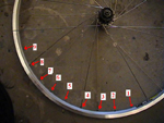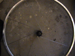 | Da var de ytre eikene på høyre side festet alle sammen. Da er det på tide å vri navet. Legg hjulet ned på bakken med høyre side opp. Som vist på Bilde 6. Vri så navet så langt du kan med klokka , mens du holder felgen i ro. | ||||