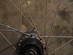 | Men hjulet er på langtnær ferdig ennå. Nå er alle eikene løse, så nå begynner strammingen. Skru alle niplene til, slik at de akkurat dekker gjengene på eikene. Som vist på Bilde 14. Grunnen til at dette gjøres, er for å få minst mulig høydekast å rette opp seinere. Her kommer også poenget med å bruke nye eiker. Dersom eikene har stått på et hjul før, er de forskjellig strukket. Dermed vil man en del høydekast selv om man følger min veiledning. Det gjør egentlig ikke noe, men det blir mer jobb å rette det opp. | ||||